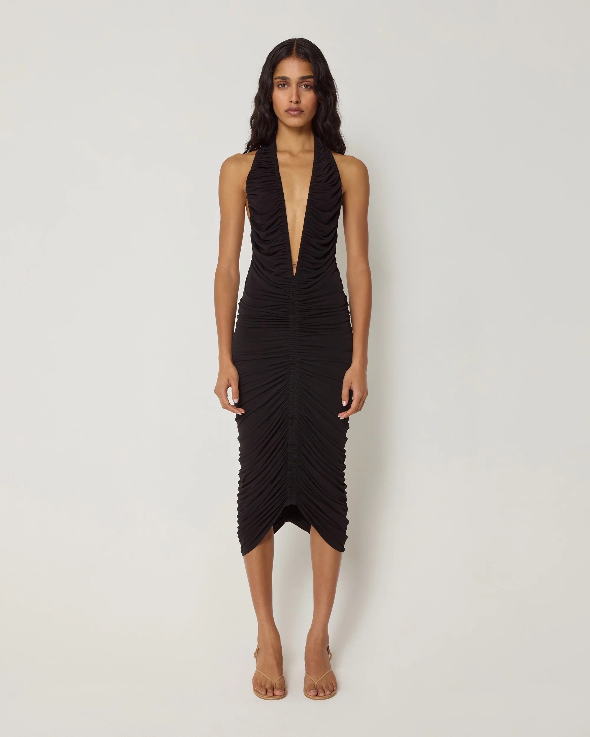 Designed in collaboration with Atlein, this midi-length dress features a deep V halter neckline. Made from a matte, stretch jersey with a draping effect.