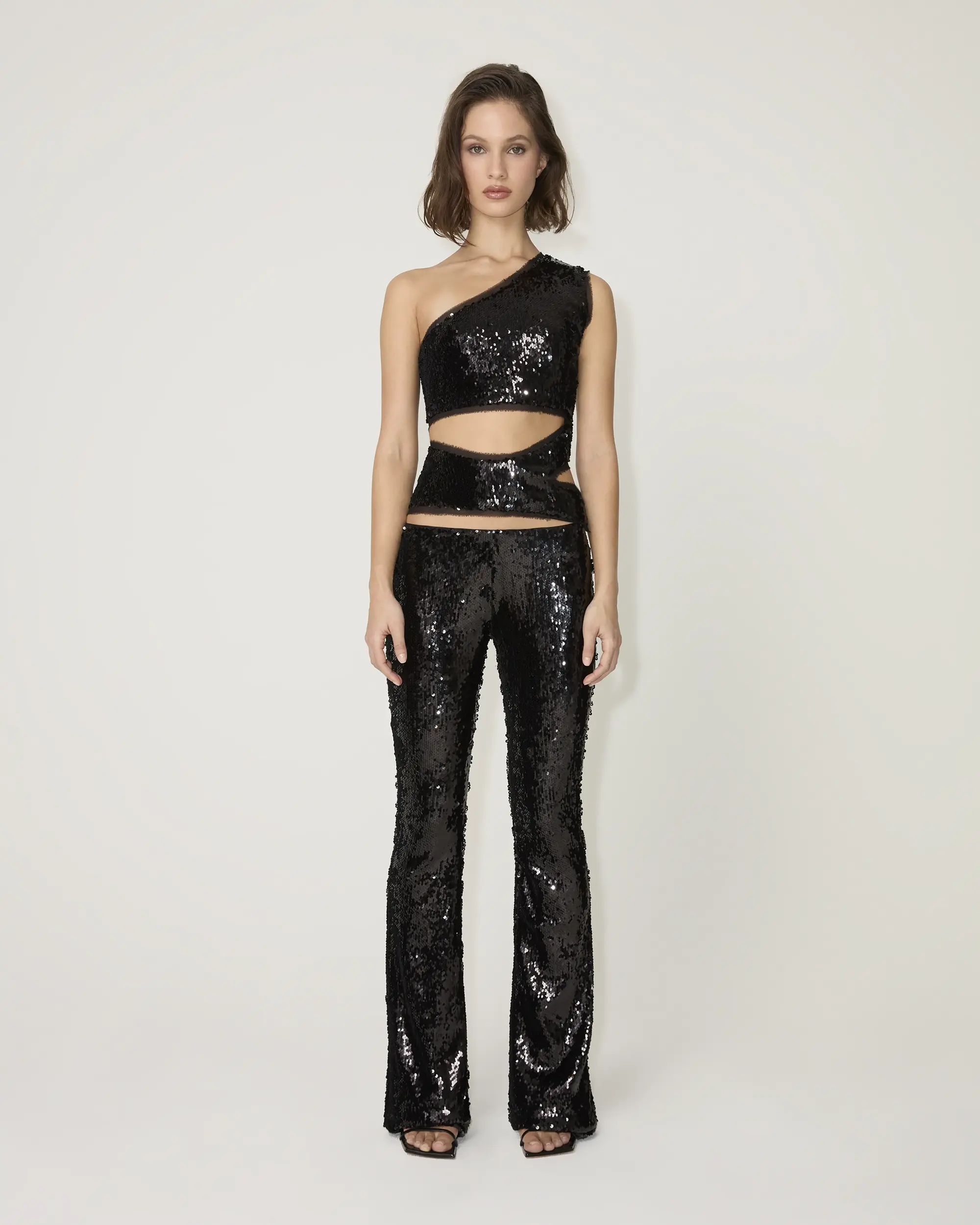 Designed in collaboration with Sia Arnika, these are sequin bootcut pants with a low rise. Made from a round, overlapping sequin fabric with a slightly stretchy mesh base.